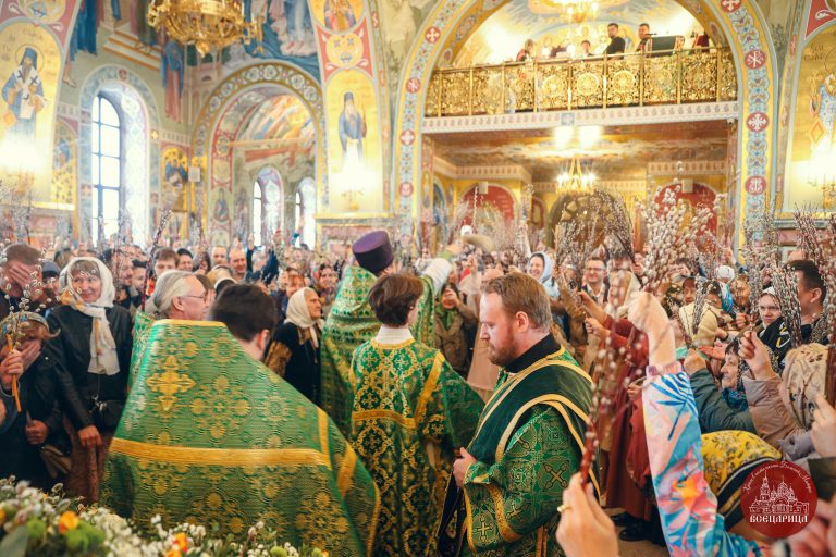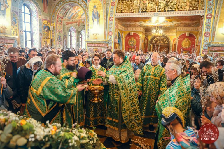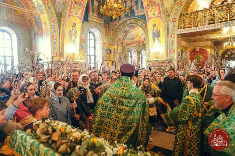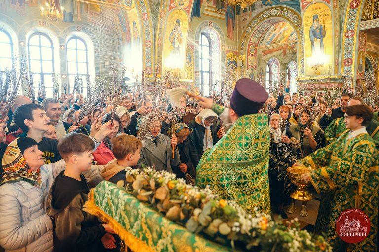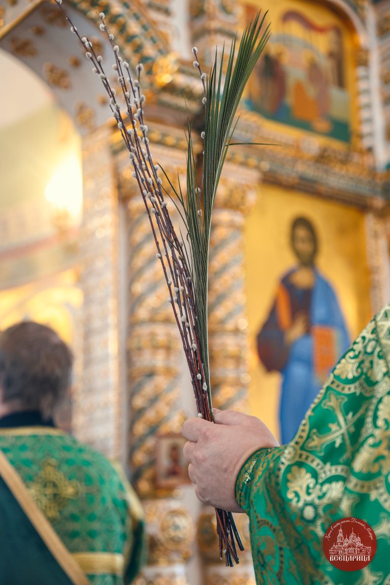 После Литургии батюшка, совершил освящение верб перед иконой. Храм был полон молящихся, во время богослужения прихожане держали вербы в руках, как приветствуя грядущего в Иерусалим Господа. Вербы знаменуют веру в Воскресение Христово, а также – в будущее всеобщее воскресение и победу над смертью. Согласно благочестивому обычаю, вербы в этот день освящают в храме и потом хранят дома верующие в память об Евангельских событиях.