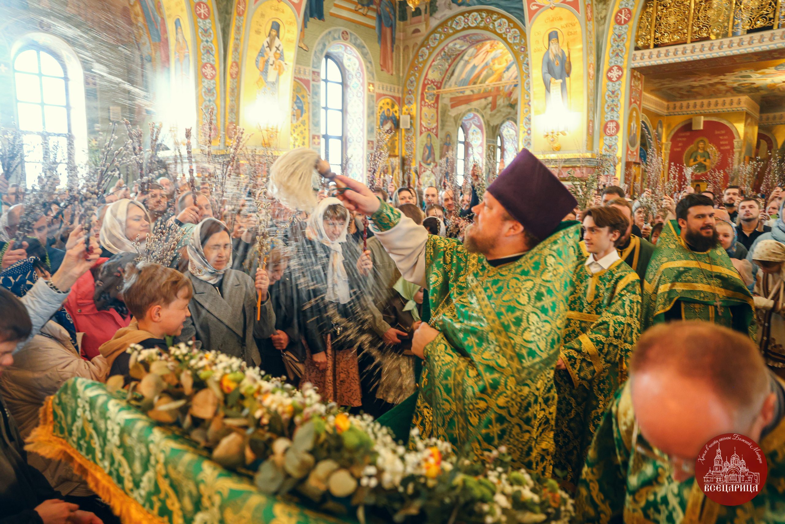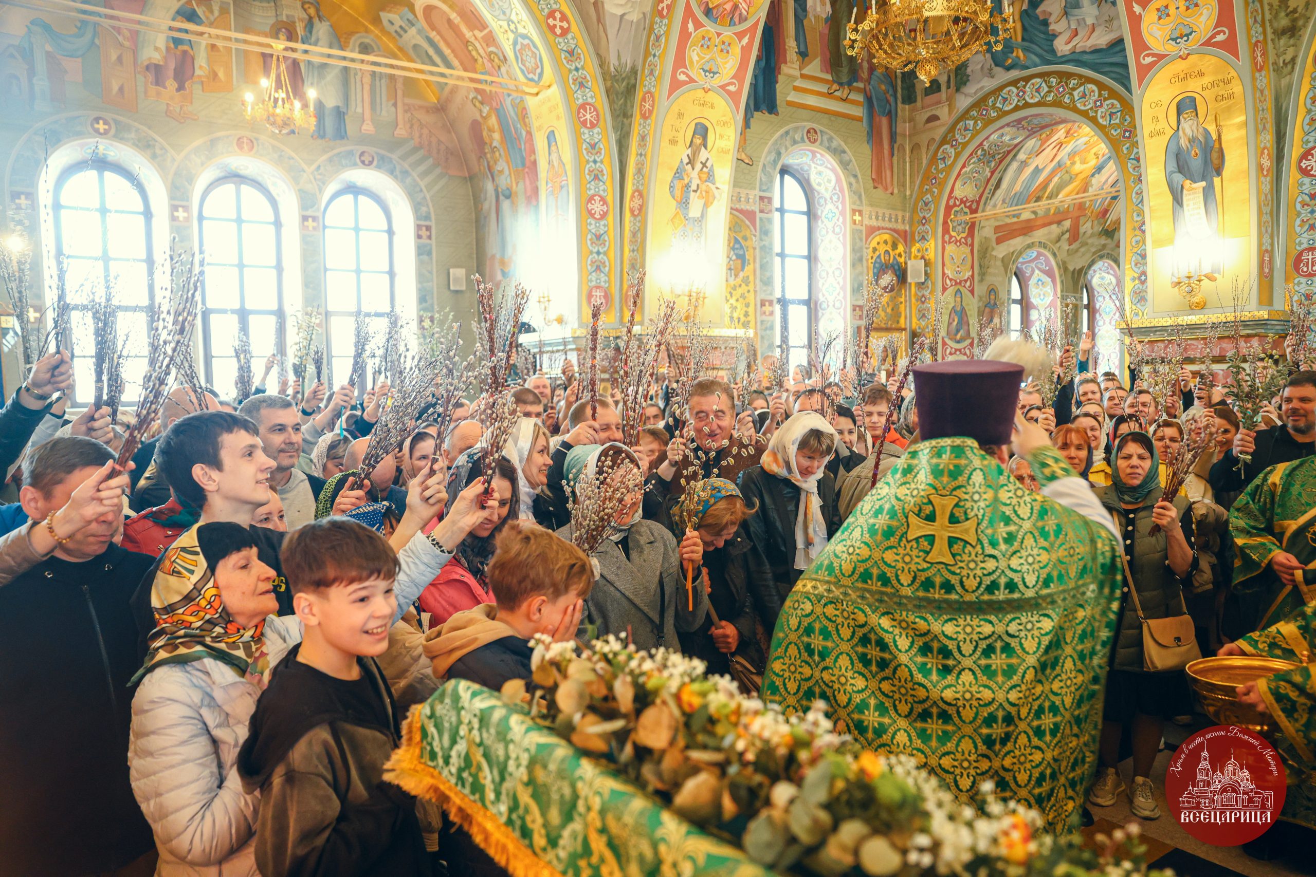 После Литургии батюшка, совершил освящение верб перед иконой. Храм был полон молящихся, во время богослужения прихожане держали вербы в руках, как приветствуя грядущего в Иерусалим Господа. Вербы знаменуют веру в Воскресение Христово, а также – в будущее всеобщее воскресение и победу над смертью. Согласно благочестивому обычаю, вербы в этот день освящают в храме и потом хранят дома верующие в память об Евангельских событиях.