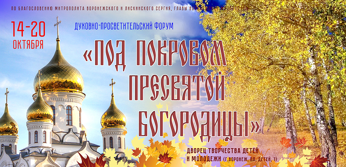 По благословению митрополита Воронежского и Лискинского Сергия, Главы Воронежской митрополии, в Воронеже будет проводиться традиционный духовно-просветительский форум «Под Покровом Пресвятой Богородицы». Программа мероприятий: